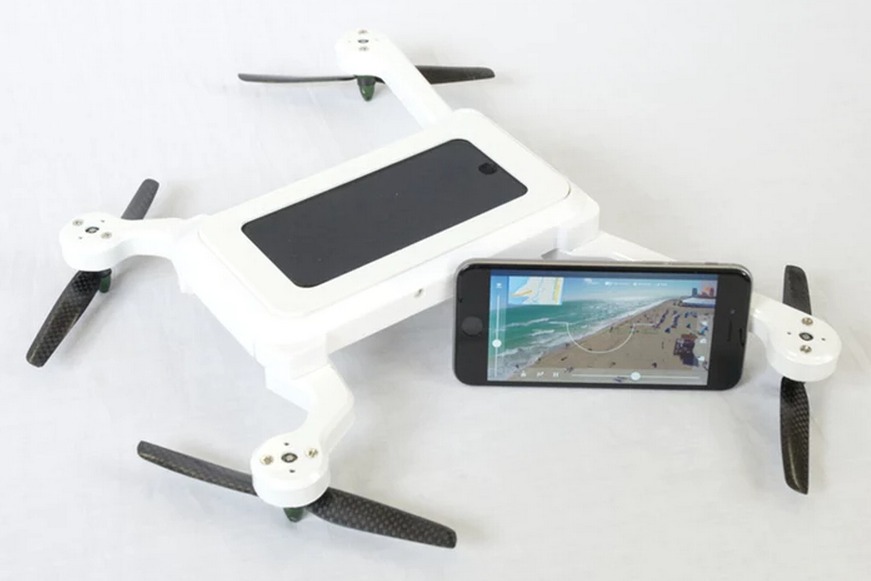 PhoneDrone 可算是一個擁有航拍功能的手機保護殼,將手機放在 PhoneDrone 中間,就可以起飛進行拍攝。不過要操控和設定 PhoneDrone,用戶需要利用另一部 iPhone 和 Android 手機進行。除了遙控,PhoneDrone 亦可以依照用戶預設的飛行高度,追蹤用戶和拍攝。