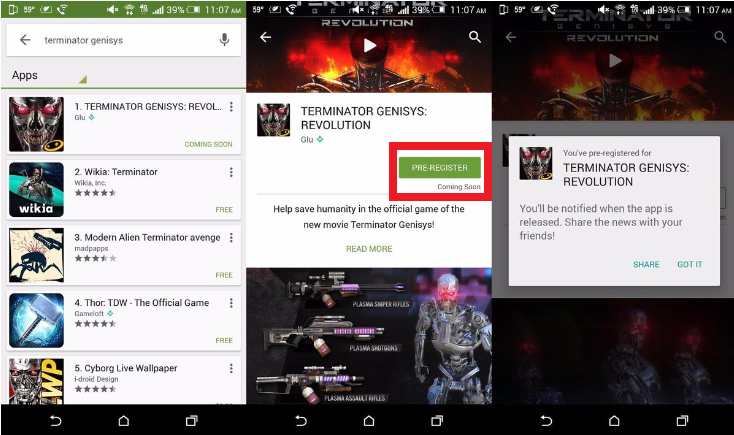 其中一個將會使用預訂服務的就是射擊遊戲《Terminator Genisys: Revolution》。有興趣的 Android 用戶可以登記預約,當遊戲推出時就會獲得通知;如果用戶反悔,只要取消註冊就可以。