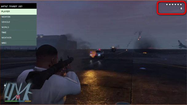 玩家 ChicheUsername 利用 Cheat Engine 將通緝程度修改至 6 星星,一旦啟動警車和警方直升機會空群而出。假若將通緝程度設定為 7 星星,遊戲則會 Hang 機跳出。有興趣的玩家可以看看上面的遊戲畫面。