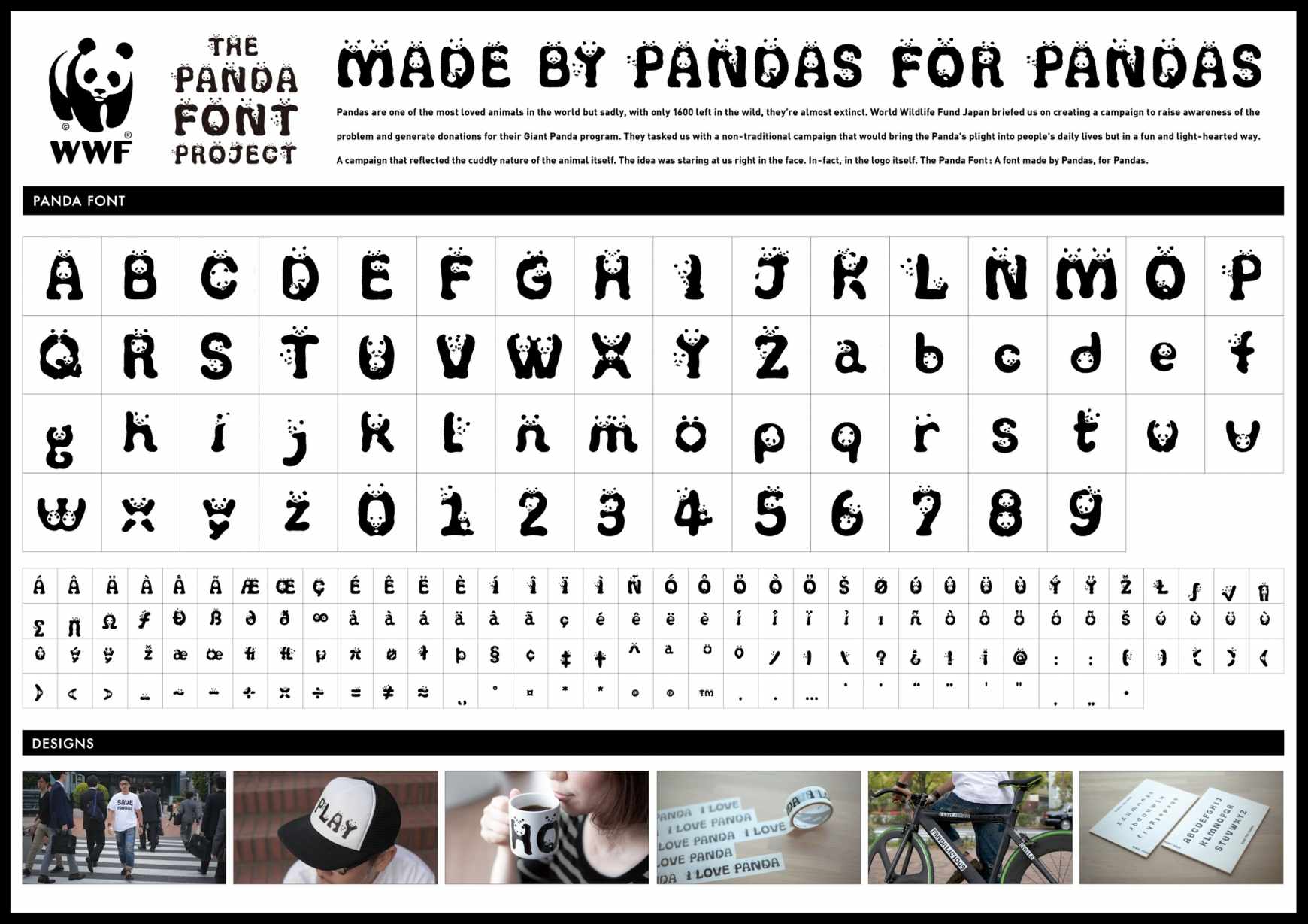 早前世界自然基金會(WWF)日本分部連同廣告公司 Ogilvy & Mather 開展了 The Panda Font Project,他們創作了一款熊貓電腦字體,每個字母都由一隻或兩隻可愛熊貓組成。WWF 希望透過字體喚起網民對大熊貓保育的關注。他們認為人類在大熊貓棲息地附近興建道路鐵路,將牠們的活動範圍分隔了,令他們繁殖的機會減少,直接影響大熊貓的數目。