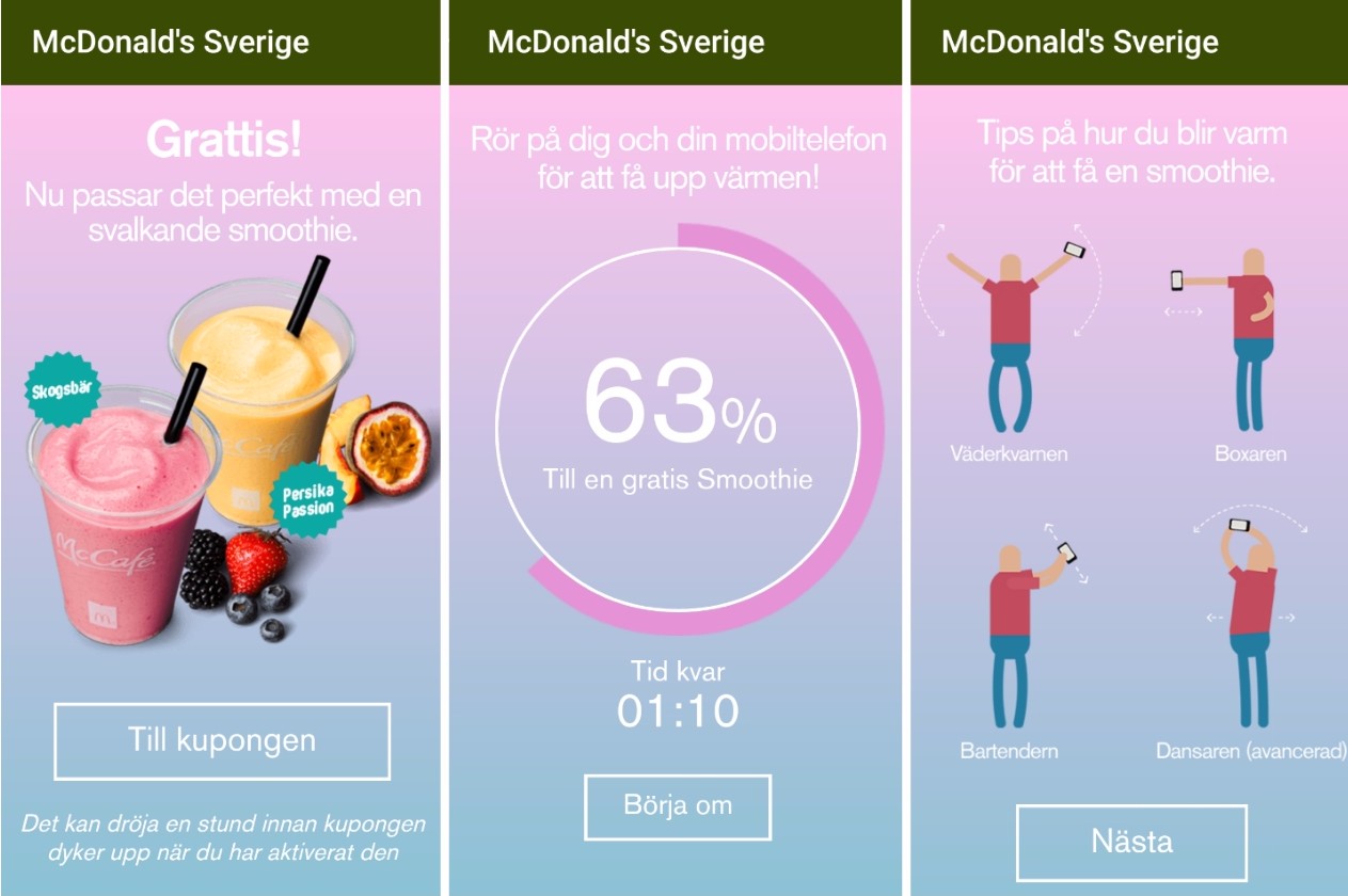 瑞典麥當勞早前更新了官方手機 App,增加了做運動送飲品活動。食客只要打開手機 App,按照示範在指定時間內完成不同的運動動作,就可以獲得一杯冰凍鮮果 Smoothie 或優惠券。這設計使用了智能手機的加速度器功能,計算和量度用戶的動作,簡簡單單就令食客做運動,而且通常走進麥當勞並不會只為了換取 Smoothie,少不免也會買個包或食薯條,在夏天來到時,麥當勞依然有生意可做。