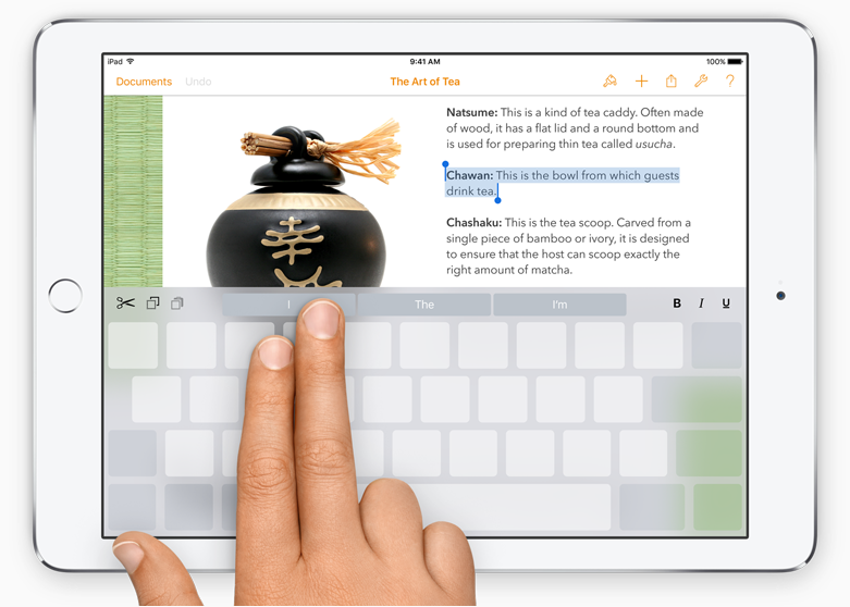 在 iOS9 上亦為 Keyboard 加入了 QuickType,三個快速進行文字工作的功能。它們分別有在鍵盤上提供複製/剪下/貼上按鈕的 Shortcut Bar:雙指在鍵盤上移動就可快速選取文字的 Easy Text Selection;以及可以讓 iOS 在接駁無線 Keyboard 時可以用到 Hotkey 的 Keyboard Shortcuts 功能。
