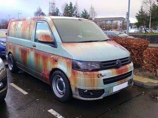 這名 Volkswagen 七人 Van 的車主於是定制了一套車身貼紙,將新簇簇的車身變成殘舊生鏽的樣子,期望能夠減低被賊人看中的機會。完工後的七人 Van 看上去殘破不堪,雖然貼紙可以撕走變相為車身加強保護,但明明購買了新車,但就好像擁有一部爛車,是否接受得到就見仁見智了。