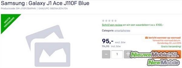 據了解荷蘭零售商 NieuweMobiel 今日在其產品列表上公開了該款全新的 Galaxy J1 Ace,至於其型號為 SM-J110F(Galaxy J1 為 SM-J100),由於其型號與早前傳聞的 Galaxy J1 Pop 一樣,因此 Samsung 最後可能決定改名推出。雖然該網站並未有公開該手機的詳細規格,但由於其價格依舊為 114.95 歐元(約 989 港元),因此整體規格應該不會有太大變動。