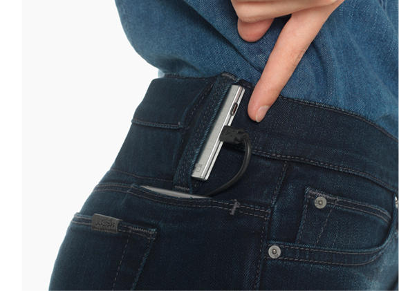 由 Joe’s Jeans 設計的 #HELLO 牛仔褲,腰間有薄身流動電源的暗格,亦有專為手機設計的後袋。只要將流動電源連接手機就可以邊行邊充電,用戶毋須孭袋或者用手拿著,份外輕鬆。每條 #HELLO 牛仔褲售價 189 美元,能夠為 iPhone 充電約七成的薄身流動電源則售 49 美元,換言之要瀟灑的代價約 1,845 港元。可惜的是,#HELLO 牛仔褲暫時只有女裝 Skinny-fit 窄身設計,未有男裝提供。