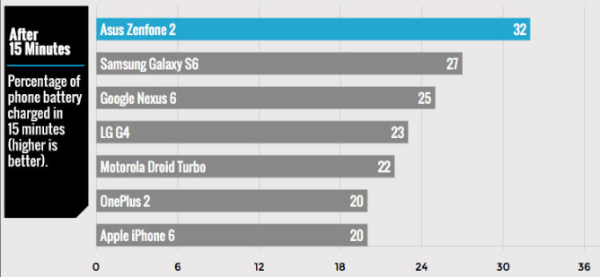 由於每部手機的電池容量有所不同(Galaxy S6 電池容量就比 ZenFone 2 少),他們亦測試了在 15 分鐘內充電百分比。測試發現 ZenFone 2 無論在 5 分鐘、15 分鐘、30 分鐘充電百分比都是最高。如果用戶經常需要在咖啡店或辦公室為手機急充,下次換機就要留意手機是否擁有快速充電功能了。
