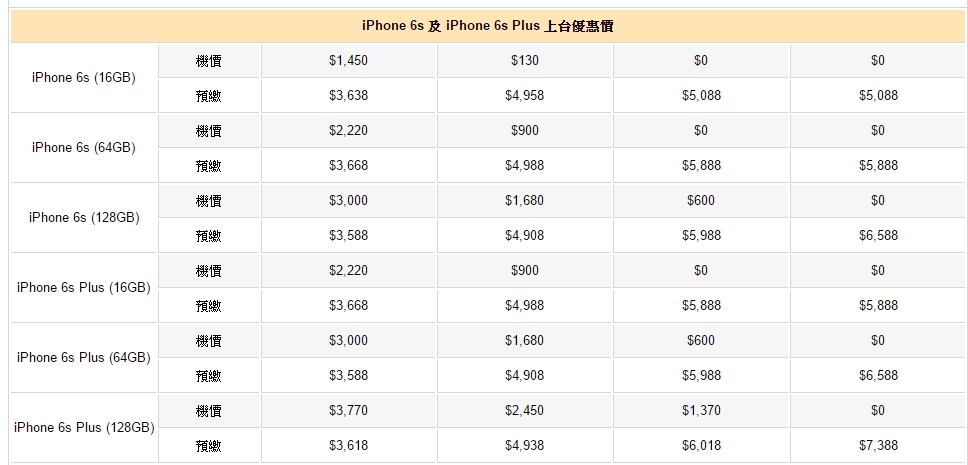 csl. iPhone 6s / 6s Plus 機價及預繳費用