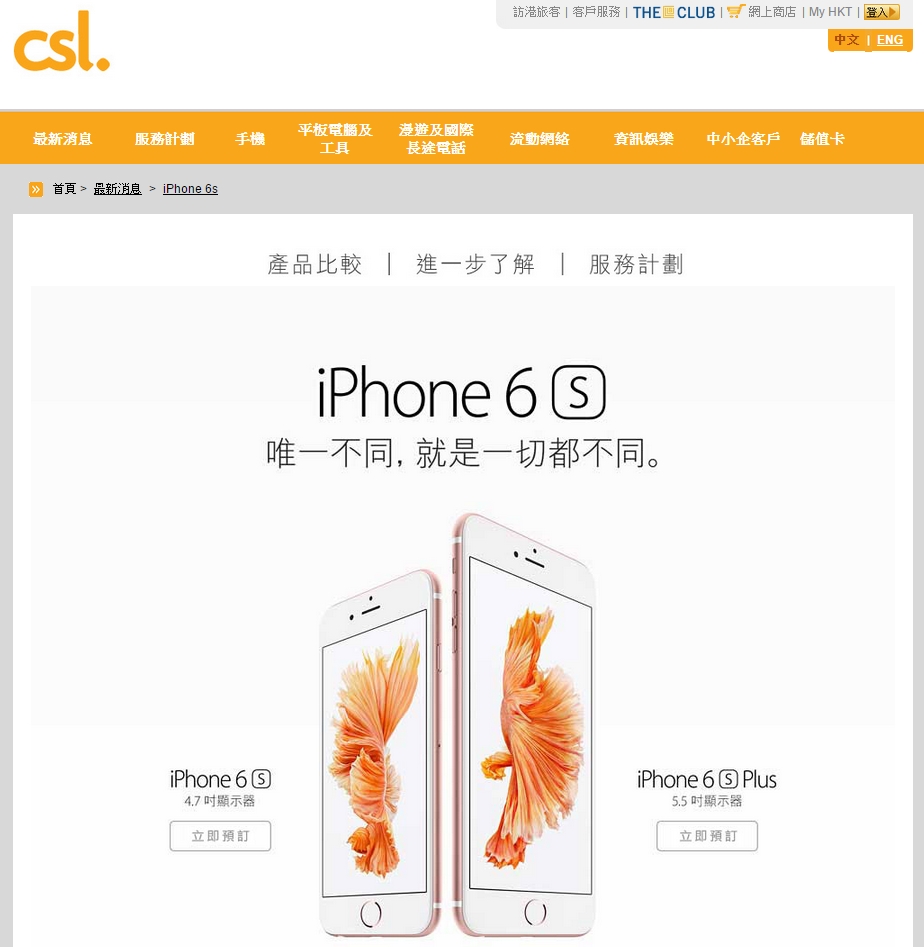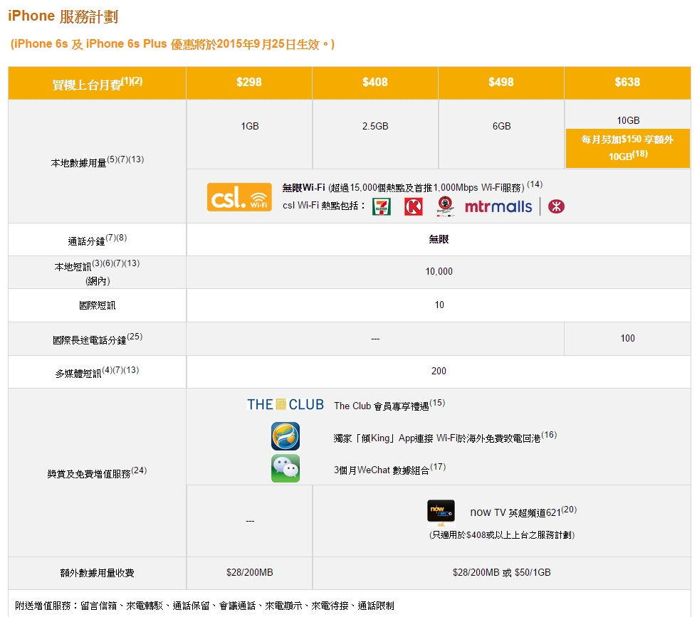 繼 SmarTone、3 香港及中國移動香港後,最後一間網絡商 csl. / 1o1o 都推出了 iPhone 6s 及 6s Plus 月費計劃,除最低的 $298 月費外,其餘月費計劃均會贈送 now TV 英超頻道 621 台,可以俾大家免費手機上睇英超!月費方面,iPhone 6s 及 6s Plus 均是最低 $498 月費可零機價上台。