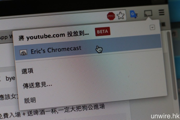 至於 PC 或 Mac 電腦,則可安裝《Chrome》網頁瀏覽器,然後登入 YouTube 網站並搜尋「東網直播」,點擊播放之後,播放畫面就會顯示一個「在電視上播放」的選項,之後的設定則與使用智能裝置的 YouTube APP 時無太大分別了。當 Chromecast 開始播放球賽之後,用戶則可如常使用電腦或者智能裝置,所有動作都不會對直播片段帶來影響,猶如傳統電視廣播一般。
