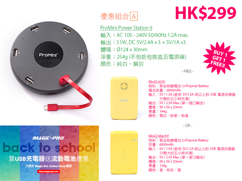 今次 Magic-Pro「Back to School」主要提供買 ProMini Power Station,送 ProMini 流動電池的優惠。而且提供兩種選擇,首先是買 6 Port 的 Power Station 送 MiniQ 6000/MiniQ Match!! 流動電池,其次就是買 10 Port 的 Power Station 送 ProMini 6000 流動電池。Power Station 兩者價錢分別是 HK$299 及 HK$399,原本已經夠便宜,再送 6000 mAh 電非常抵玩。