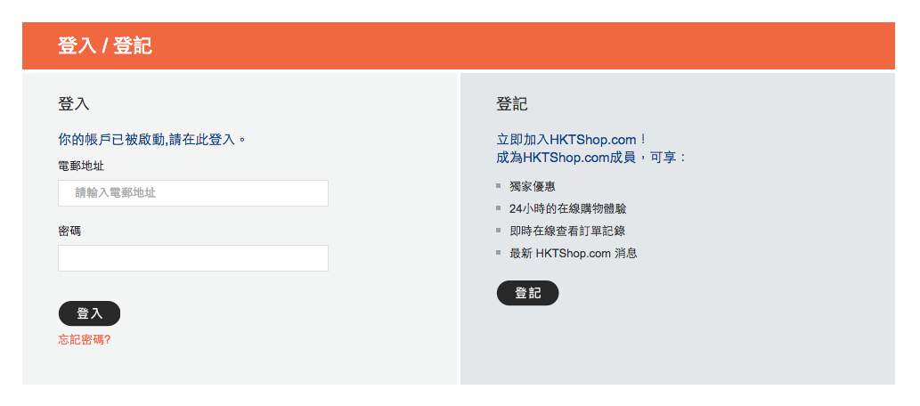 ▲Step 01:首先點按此進入 HKTShop,然後點按右上角「登入 / 登記」,再點選「登記」。