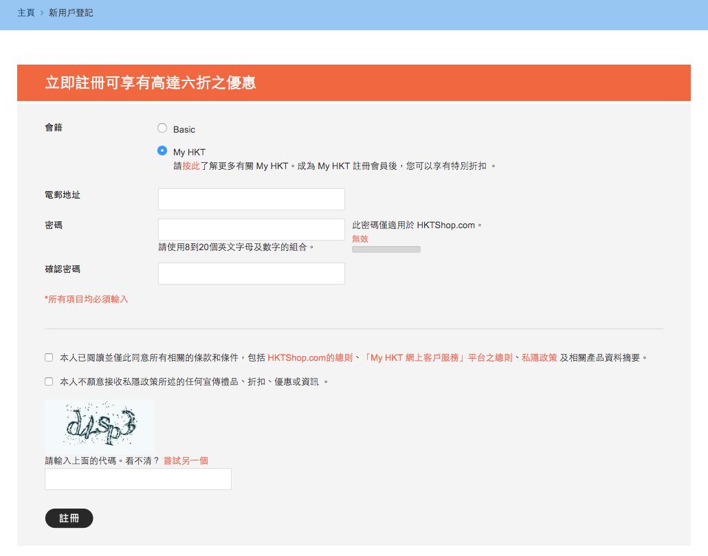▲Step 02:然後選擇「My HKT」再填入相關資料,最後點按「註冊」。
