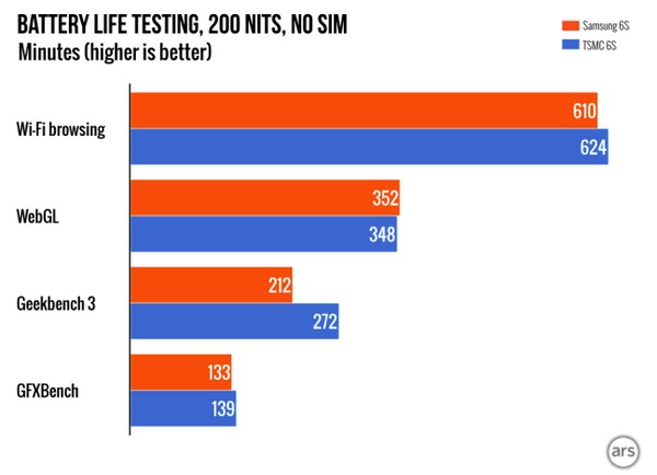 據了解今次測試的對象分別為台積電版及 Samsung 版 A9 處理器 iPhone 6s,而為了公平起見,因此兩部手機都在相同條件的環境下測試,而每項測試都會進行兩次,並取並平均數。至於測試方法包括有四種,分別為 Wi-Fi 網頁瀏覽、WebGL、Geekbench 3 及 GFXBench,而當中可以看到在 Wi-Fi 網頁瀏覽及 GFXBench 中,雖然台積電版比起 Samsung 版有更長的續航力,但兩者的差距就只有 2.2% 及 4.3%;至於在 WebGL 測試中,Samsung 版甚至比起台積電版更優勝;唯一比較明確的分別就在於 Geekbench 3,兩者的續航力差距大約有 22%。