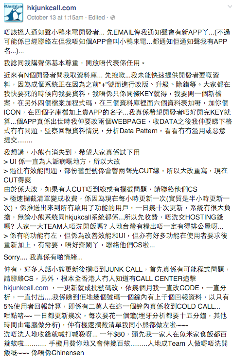 最近小熊來電更新事件搞到滿城風雨,有人講升級後攔截效果差咗、進階功能無咗云云。之後就有傳另一隻叫做「小鴨來電」嘅 APP 將會面世,並且宣稱會採用同小熊來電相同嘅 HKJunkCall.com 資料庫,此舉惹來 HKJunkcall 方面發表聲明大罵一場!就此事,我們就找來 HKJunkcall 的管理員 William 做個專訪,佢表示之所以嬲,只係為咗「想得到番基本尊重」。下文有更多資料: