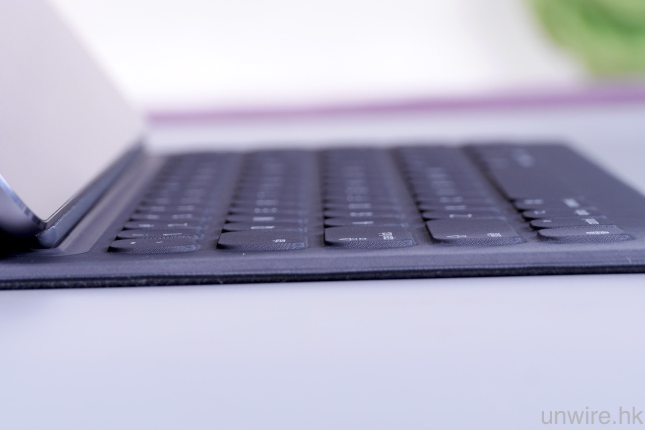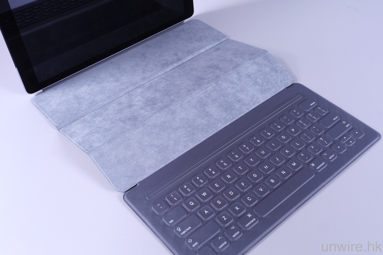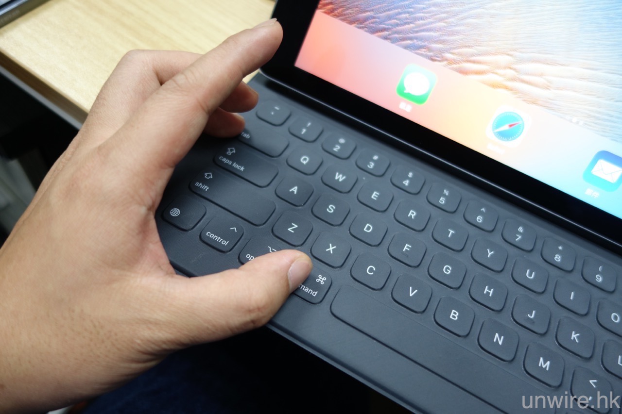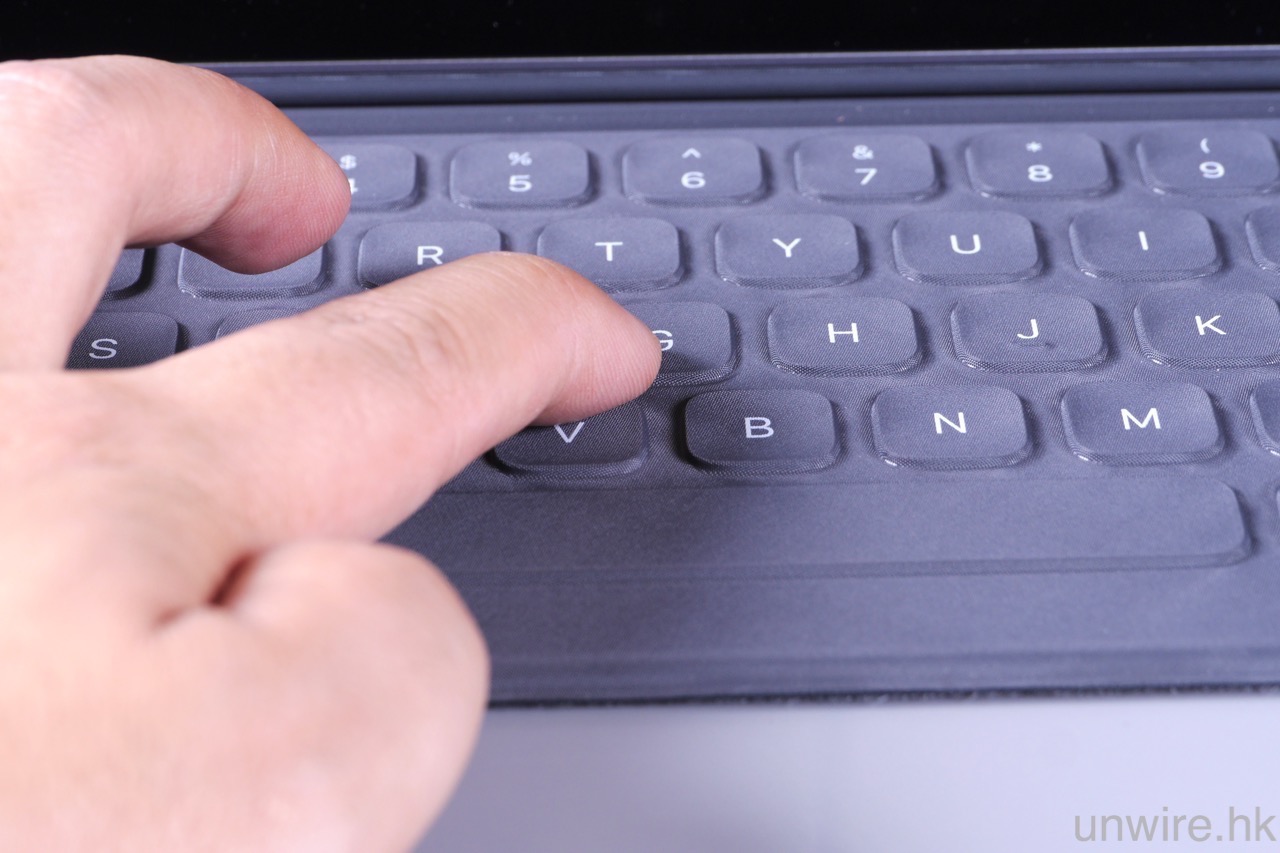 既然 Smart Keyboard Cover 叫做 Keyboard,重點自然係個鍵盤度啦。筆者用過之後,就發覺佢係打字上都算幾舒服,甚至覺得比新 MacBook 嘅鍵盤有更深嘅鍵深,就算長時間打字都唔會太累(雖然呢個鍵盤並非採用機械式鍵盤)。另外,鍵盤亦十分穩陣,因為佢晾住機身個位都有磁石設計,就算拿起機身,鍵盤都唔會從 iPad Pro 機身甩出來;而斜晾住機身個時,亦唔覺有頭重尾輕,機身會向後翻嘅情況,個設計都算做得幾好。另外,鍵盤唔止採用 full-size 鍵盤設計,鍵距剛剛好,感覺就好似係 MBA 鍵盤上面打字咁;而且按鍵都好齊全,唔止有埋數字鍵,就算轉換輸入法,連組合鍵都唔洗襟,只要按下左下角嘅按鍵就得,設計得好體貼。另外,如果大家有用開 Mac 電腦嘅話,唔少組合鍵係 iPad Pro + Smart Keyboard Cover 上面都用得番,尤其是 Command + Tab,仲可以取代雙按 Home 鍵切換使用中嘅程式,呢個真係超好用嘅組合鍵。