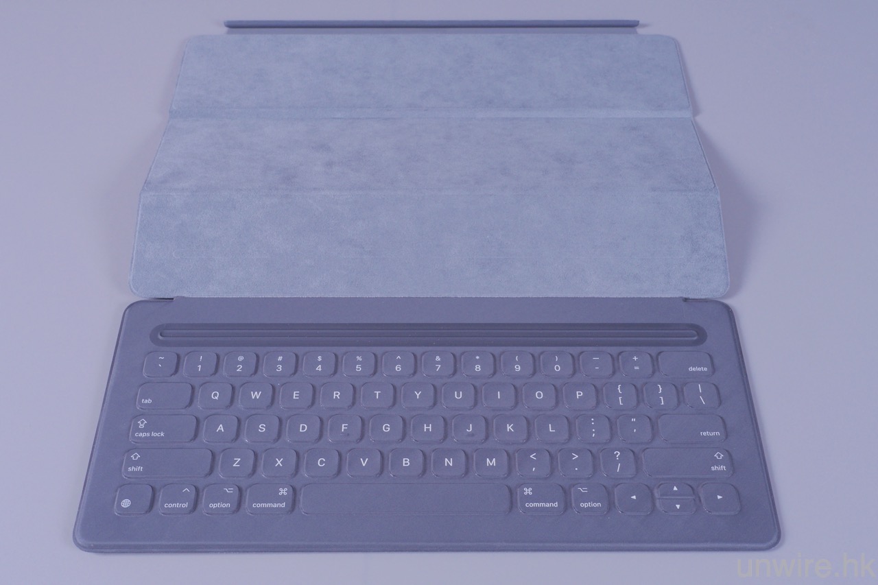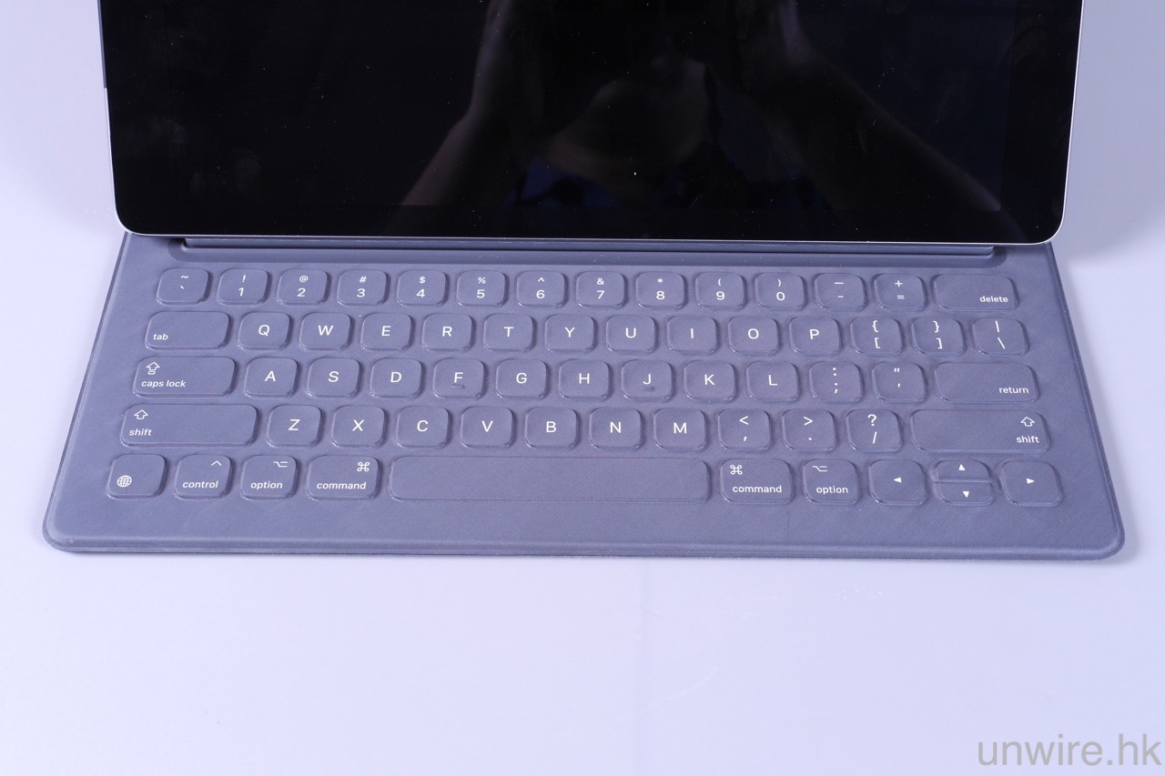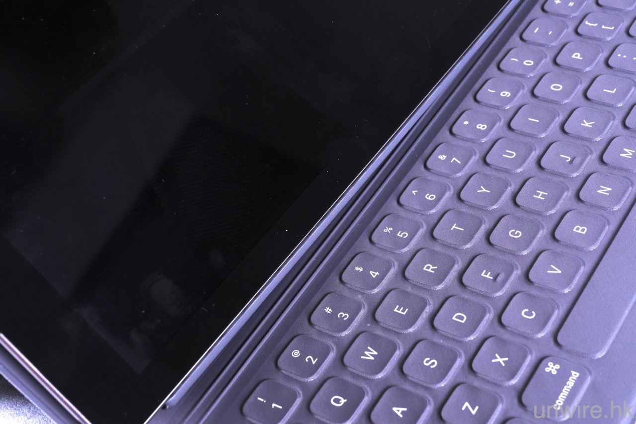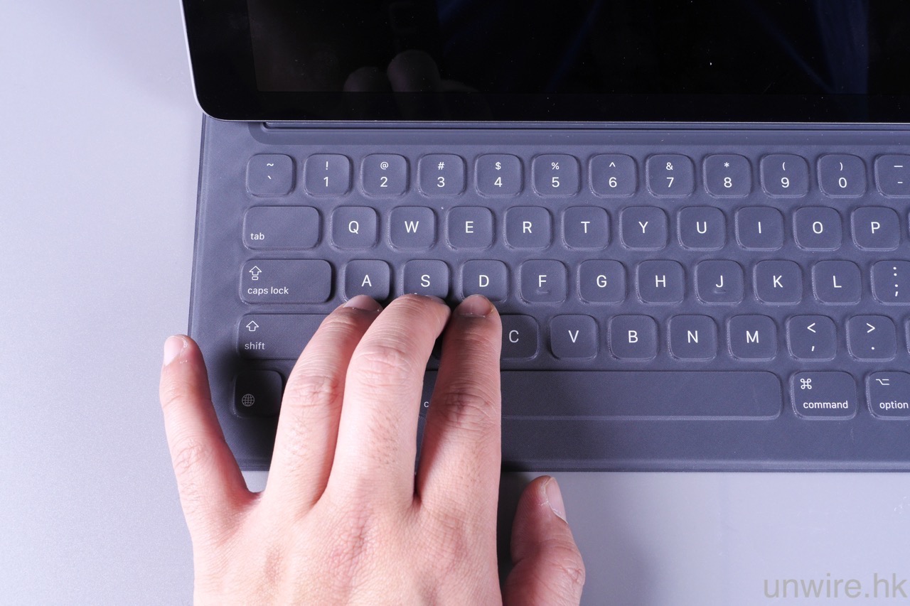 既然 Smart Keyboard Cover 叫做 Keyboard,重點自然係個鍵盤度啦。筆者用過之後,就發覺佢係打字上都算幾舒服,甚至覺得比新 MacBook 嘅鍵盤有更深嘅鍵深,就算長時間打字都唔會太累(雖然呢個鍵盤並非採用機械式鍵盤)。另外,鍵盤亦十分穩陣,因為佢晾住機身個位都有磁石設計,就算拿起機身,鍵盤都唔會從 iPad Pro 機身甩出來;而斜晾住機身個時,亦唔覺有頭重尾輕,機身會向後翻嘅情況,個設計都算做得幾好。另外,鍵盤唔止採用 full-size 鍵盤設計,鍵距剛剛好,感覺就好似係 MBA 鍵盤上面打字咁;而且按鍵都好齊全,唔止有埋數字鍵,就算轉換輸入法,連組合鍵都唔洗襟,只要按下左下角嘅按鍵就得,設計得好體貼。另外,如果大家有用開 Mac 電腦嘅話,唔少組合鍵係 iPad Pro + Smart Keyboard Cover 上面都用得番,尤其是 Command + Tab,仲可以取代雙按 Home 鍵切換使用中嘅程式,呢個真係超好用嘅組合鍵。