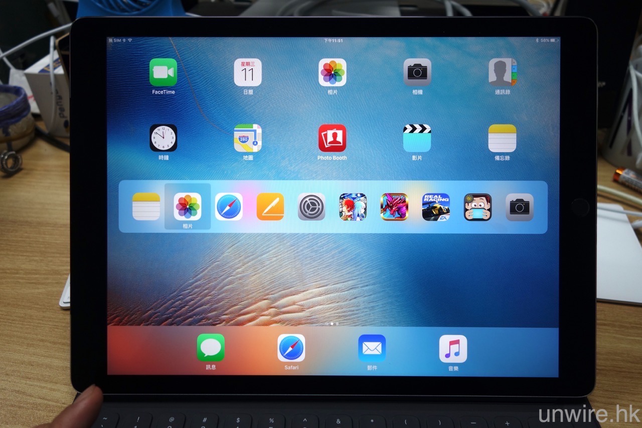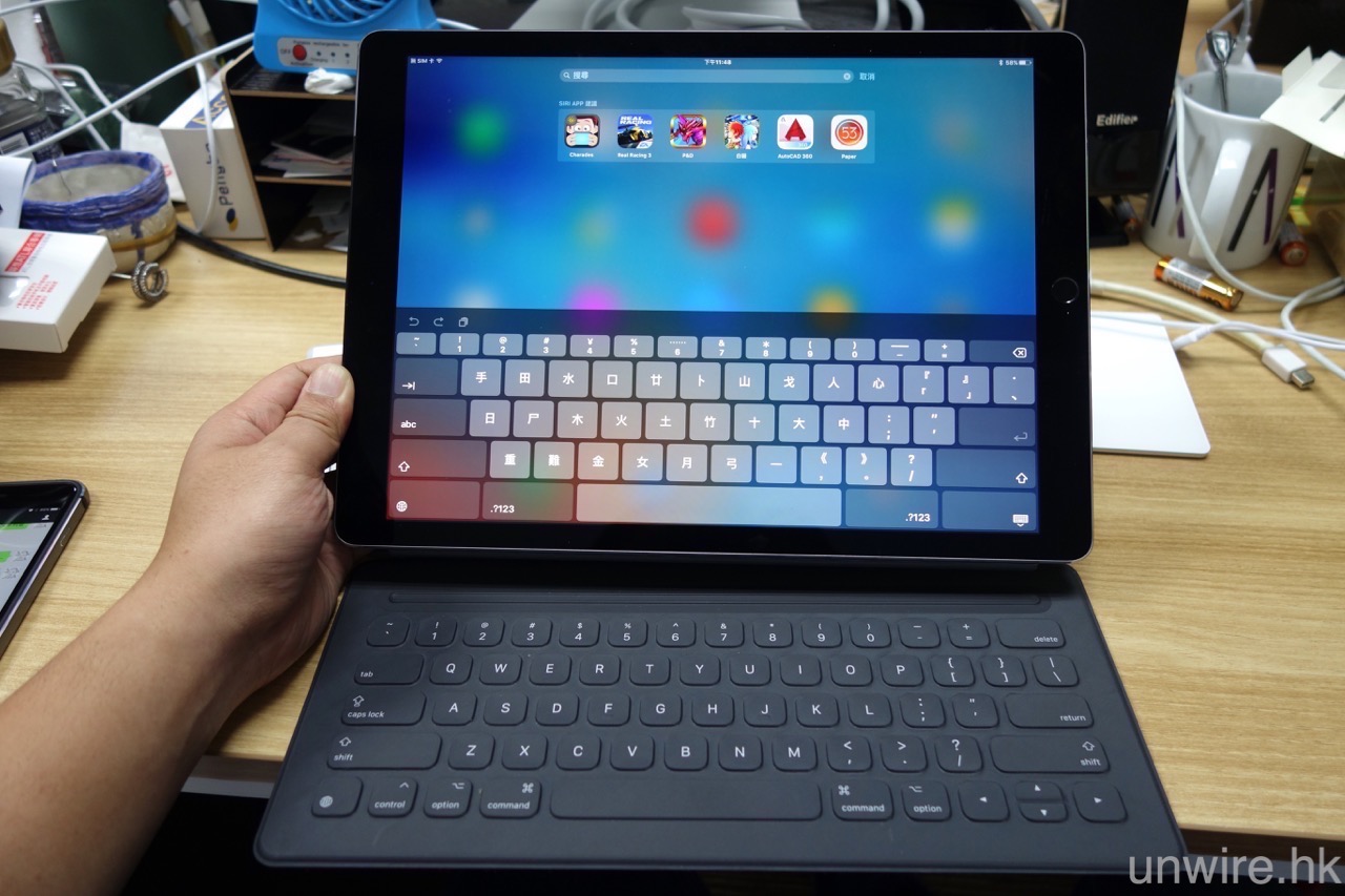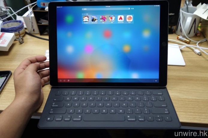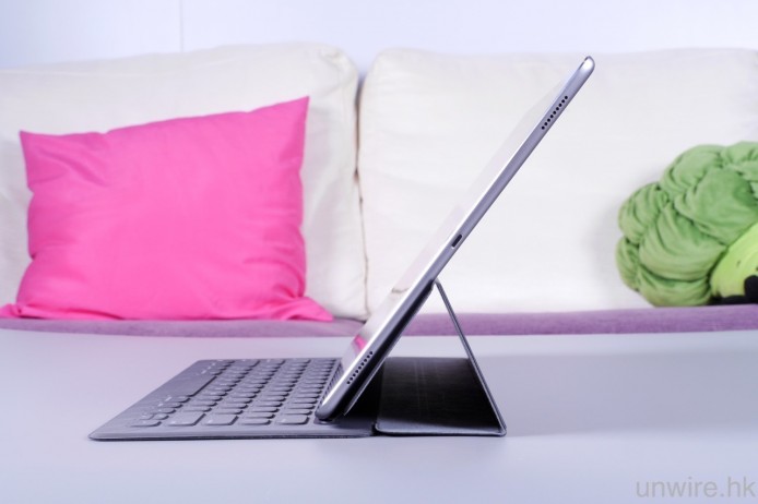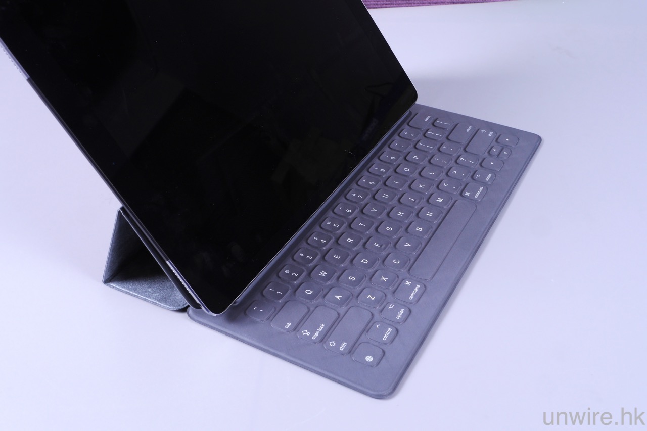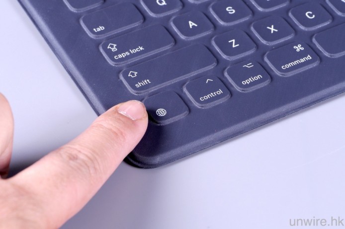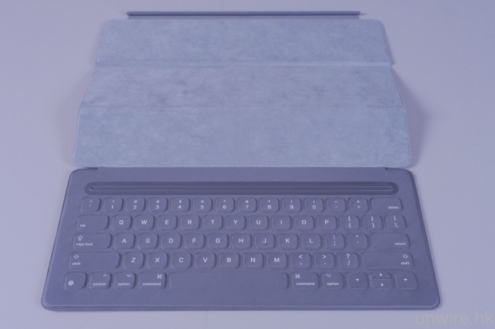 既然 Smart Keyboard Cover 叫做 Keyboard,重點自然係個鍵盤度啦。筆者用過之後,就發覺佢係打字上都算幾舒服,甚至覺得比新 MacBook 嘅鍵盤有更深嘅鍵深,就算長時間打字都唔會太累(雖然呢個鍵盤並非採用機械式鍵盤)。另外,鍵盤亦十分穩陣,因為佢晾住機身個位都有磁石設計,就算拿起機身,鍵盤都唔會從 iPad Pro 機身甩出來;而斜晾住機身個時,亦唔覺有頭重尾輕,機身會向後翻嘅情況,個設計都算做得幾好。另外,鍵盤唔止採用 full-size 鍵盤設計,鍵距剛剛好,感覺就好似係 MBA 鍵盤上面打字咁;而且按鍵都好齊全,唔止有埋數字鍵,就算轉換輸入法,連組合鍵都唔洗襟,只要按下左下角嘅按鍵就得,設計得好體貼。另外,如果大家有用開 Mac 電腦嘅話,唔少組合鍵係 iPad Pro + Smart Keyboard Cover 上面都用得番,尤其是 Command + Tab,仲可以取代雙按 Home 鍵切換使用中嘅程式,呢個真係超好用嘅組合鍵。