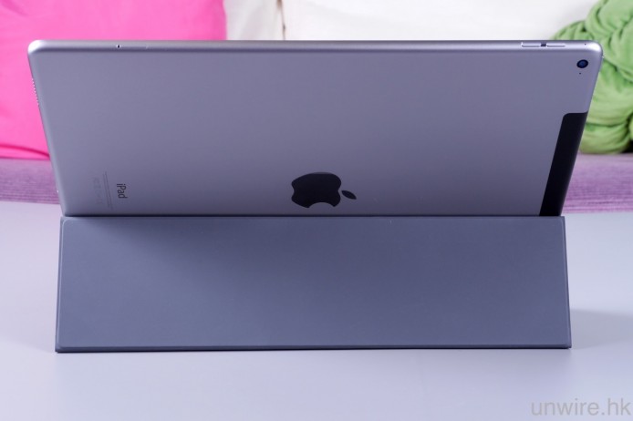 ▲座檯模式嘅側面同埋背面圖,可見 iPad Pro 機身係呢個設計下都幾穩陣。