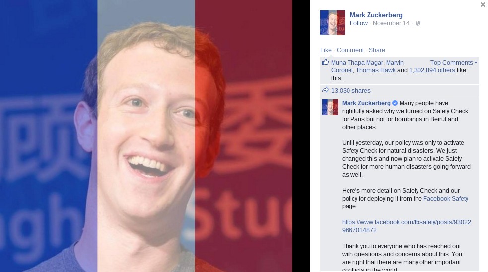 巴黎的恐怖襲擊死傷枕藉轟動全球,Facebook 除了推出報平安服務,又讓用戶們更換紅白藍濾鏡的頭像相片,以表達對巴黎的支持。上一次 Facebook 的 Timeline 大規模換頭像,相信是用戶換上彩虹濾鏡撐美國同性婚姻合法化。更換頭像本身是極個人的選擇,偏偏不少人喜歡藉此成為批判人的理由。