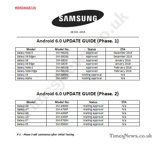 根據 Times News 取得 10 月尾 Samsung 發出的內部文件,Android 6.0 升級會分為三個階段。首兩階段獲得升級的手機型號已經確認,至於第三階段的手機則有待測試後公佈。將會在首階段升級的包括 12 月升級的 Galaxy Note 5、S6 Edge+、明年 1 月升級的 S6、S6 Edge 和 2 月升級的 Note 4 和 Note Edge;至於 S5 和 Alpha 都屬第一階段手機,但升級日期尚未確定。