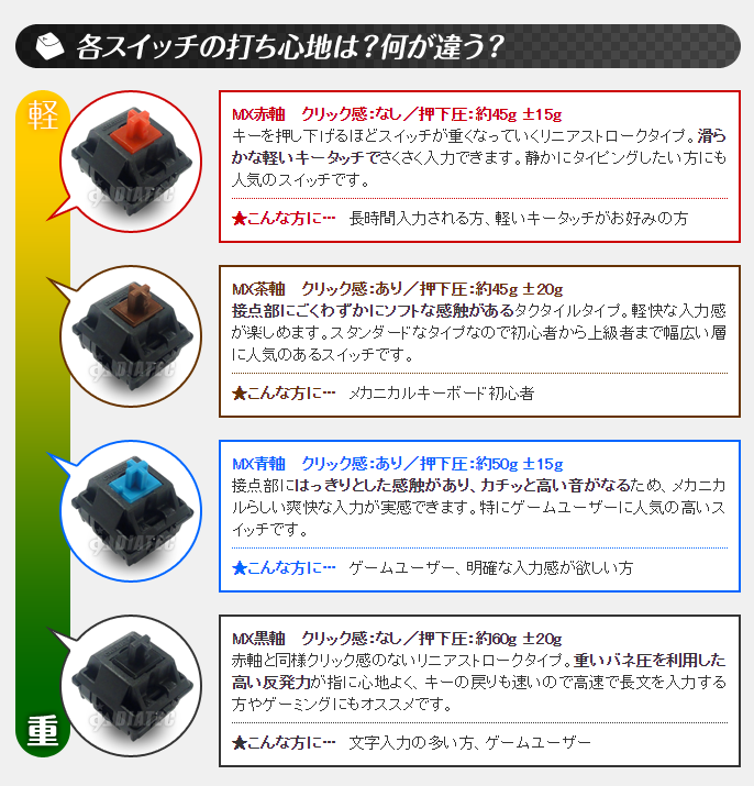 因為 Cherry MX 的專利已到期,現時不少廠商的機械 Keyboard 都使用 Cherry MX 為軸體,當中主流就分有青 (藍)、紅、茶 (啡)、黑四軸,以及有其他如綠、白、灰等 (當然亦有一些非 Cherry 的機械 Keyboard)。不同的軸體其行程 (按鈕深度)、觸發行程、壓力、回彈壓力、發出聲量都不同,以下就簡單講主流的三種: