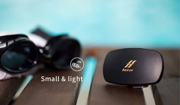輕巧的 Beker 體積為 2.9 x 1.6 x 0.7 吋,重 1.2 安士;配合彈性的頭帶使用,只要將 Beker 貼著後腦顱骨,就能夠透過骨導式技術聽歌。使用 Beker 除了不需要擔心耳塞在跑步或游泳時掉落,在戶外訓練時耳朵不會被耳塞塞住,就能夠維持對外在環境的警覺性。Beker 擁有 IPX8 防水功能,就算一邊佩戴一邊游水和浮潛都沒有問題。