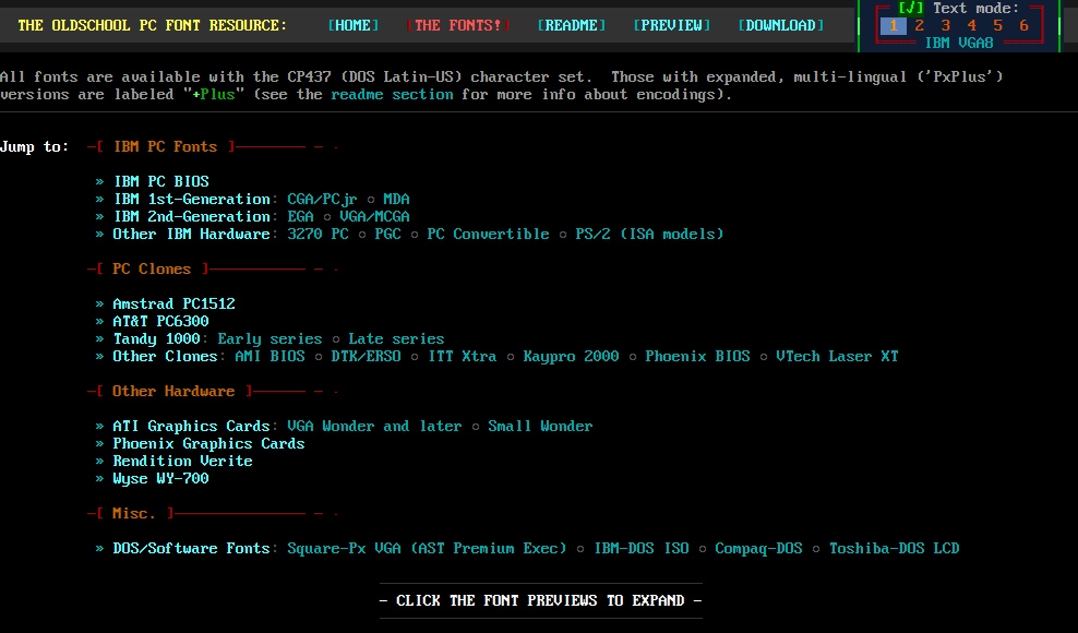 這套「The Oldschool PC Font」有 TrueType(TTF)和 Bitmap(FON)兩款格式,用戶可以下載和安裝到電腦使用。相比起現在電腦預載的字體,這些有幾十年歷史的字體就「起狗牙」,不過用戶如果經歷過未有 Windows 圖像介面的年代,應該別有一番滋味。提供下載的網站設計本身亦非常懷舊,予人使用 CGA、VGA 顯示屏幕的感覺。