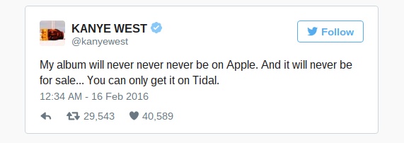自從串流音樂服務推出,不少樂迷都開始採用;然而很多歌手對於 Spotify、Apple Music、iTunes Music 的分帳問題並不滿意,選擇不再在這些網上音樂平台將唱片或單曲上架。最新加入向 Apple 說不的重量級歌手,是美國著名 Hip Hop 歌手 Kanye West。