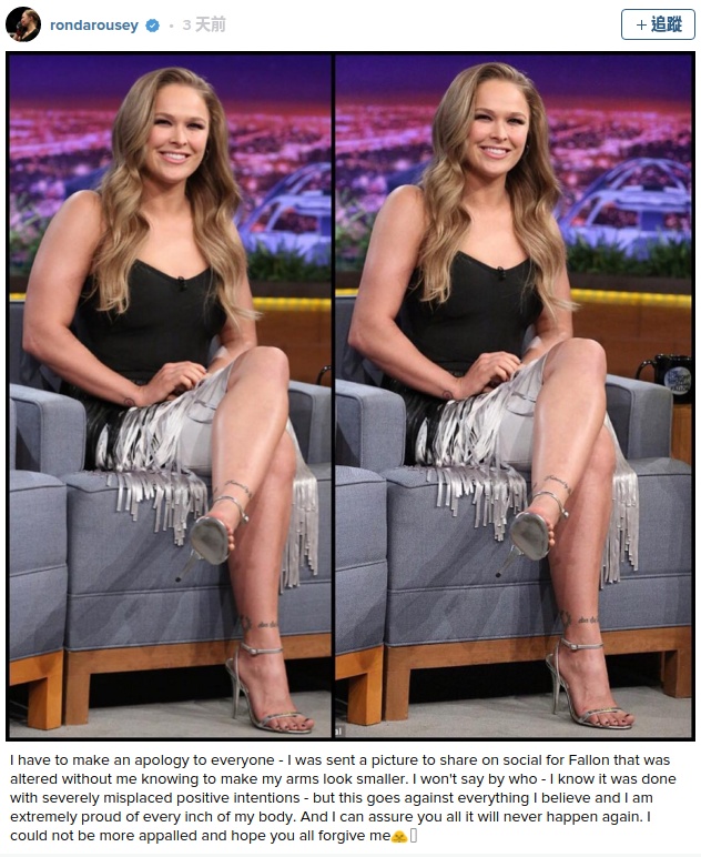 話說這名奧運柔道冠軍、UFC 拳手兼武打女星,早前出席《The Tonight Show with Jimmy Fallon》接受訪問,其後 Rousey 的 Instagram 上載接受訪問的相片,很多粉絲 Like 了相片和留下評論。一天之後,Rousey 突然在 Instagram 公開發表道歉聲明,原來她的宣傳團隊在未經 Rousey 同意下私自修改了相片,把原本比較粗壯的手臂變瘦。