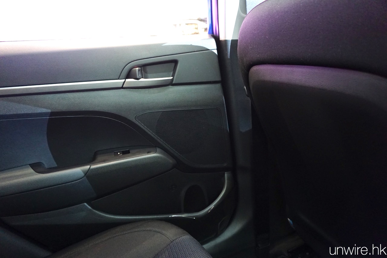 車身長度及闊度都比先代增加,所以車廂內部都變得寬敞,Elantra 更憑著 110.2 立方英呎的內部空間,被美國環境署(EPA)評定為中型房車,籮文坐過後座,就算籮文「肥屍大隻」,Foot Room 都有大約一個拳頭位。當然,要坐得舒服又點只闊敞就夠呀,採用多種隔音及吸音物料,又將車門玻璃加厚,就連雨刷器(水撥)都有改良,以降低刮動時的聲響和震動。