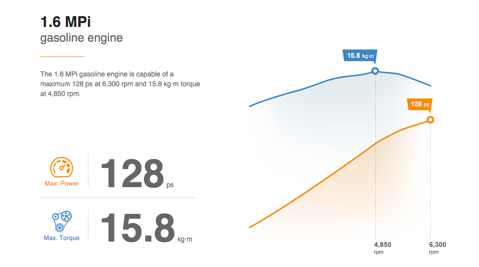 雖然車身比上一代大,但重量卻減低了。重量減少並不代表有偷工減料,仲「落足料」添!底盤以 53% 超高強度鋼鐵打造,相比上一代的 21% 比例更堅硬。安全穩固之餘,更能提高駕駛性能,轉向時更穩定。搭載 Gamma 1.6 MPi 四缸自然吸氣引擎,能在 6,300 轉輸出最高 128 匹馬力,最大扭力則為 15.8 kgm/4,850 rpm,採用六前速自動波箱(附 +/- 波)。Elantra 一向都係慳油之選,新一代當然更有進步,耗油量由 7.1L/100km 降至 6.5L/100km(即每升 15.4 公里),同電動車或者混能車(Hybrid)比較,當然冇得比,但與同級車款比較,Elantra 絕對係上游份子。除咗車價吸引,油錢都幫你慳埋!