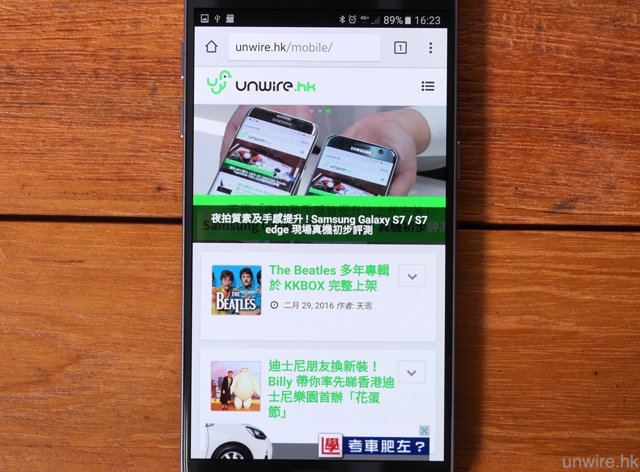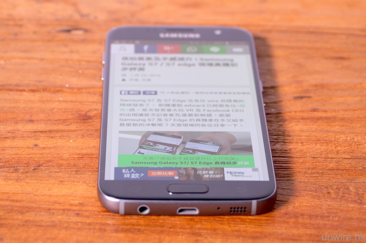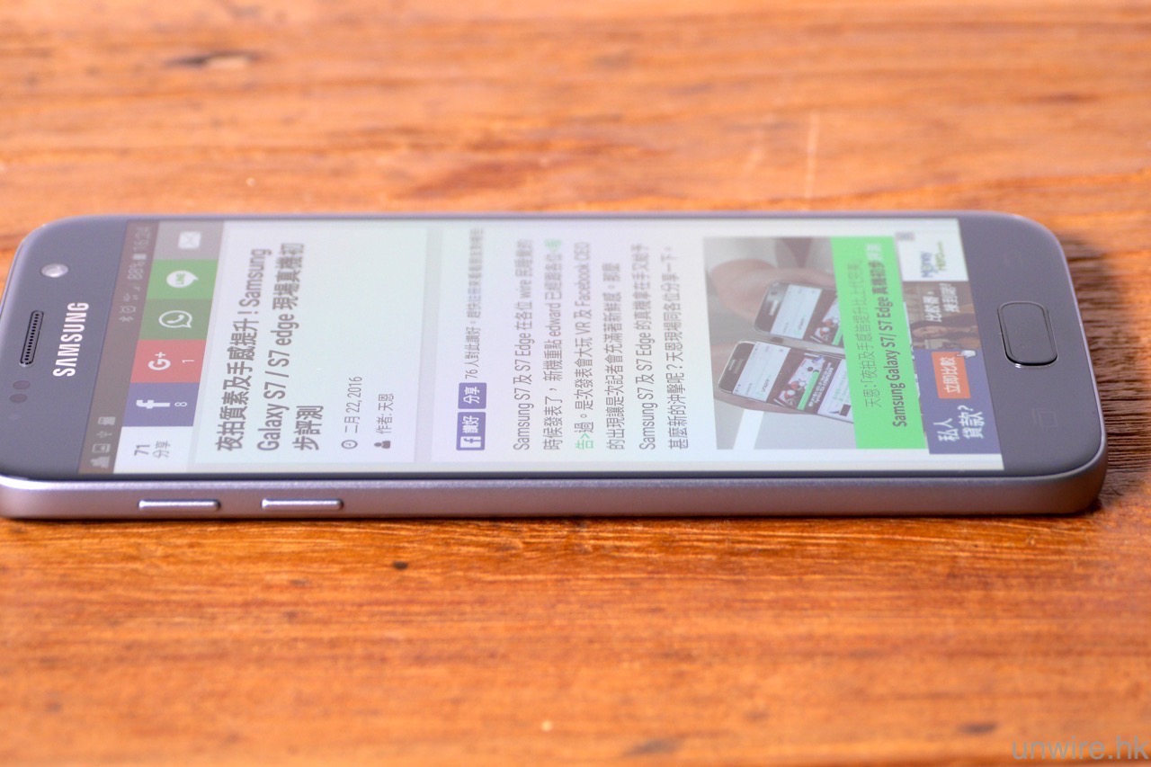 至於可視角度方面,AMOLED 熒幕亦一向擁有高可視角度的優勢,這一點在 S7 及 S7 edge 上亦見得到,筆者試過從側面去睇熒幕,亦未有見到亮度降低或變色的情況,這一點大家就不用擔心了。此外,相信有些 wire 民亦想知道 S7 edge 的曲面熒幕在瀏覽網頁時,邊位會否仍與上代一樣,出現文字現在曲面熒幕上,導致瀏覽困難的情況。筆者測試過後,發覺此問題仍然存在,相信這是用上雙曲面熒幕的「死症」,不過筆者看到不少網頁(包括 unwire.hk),在瀏覽內文時會刻意避開最邊位置不放文字,只要大家用「直度」模式瀏覽網頁,文字出現在曲面熒幕位置的機會是較細的。