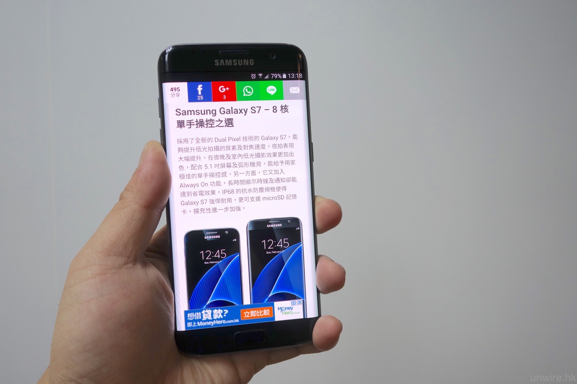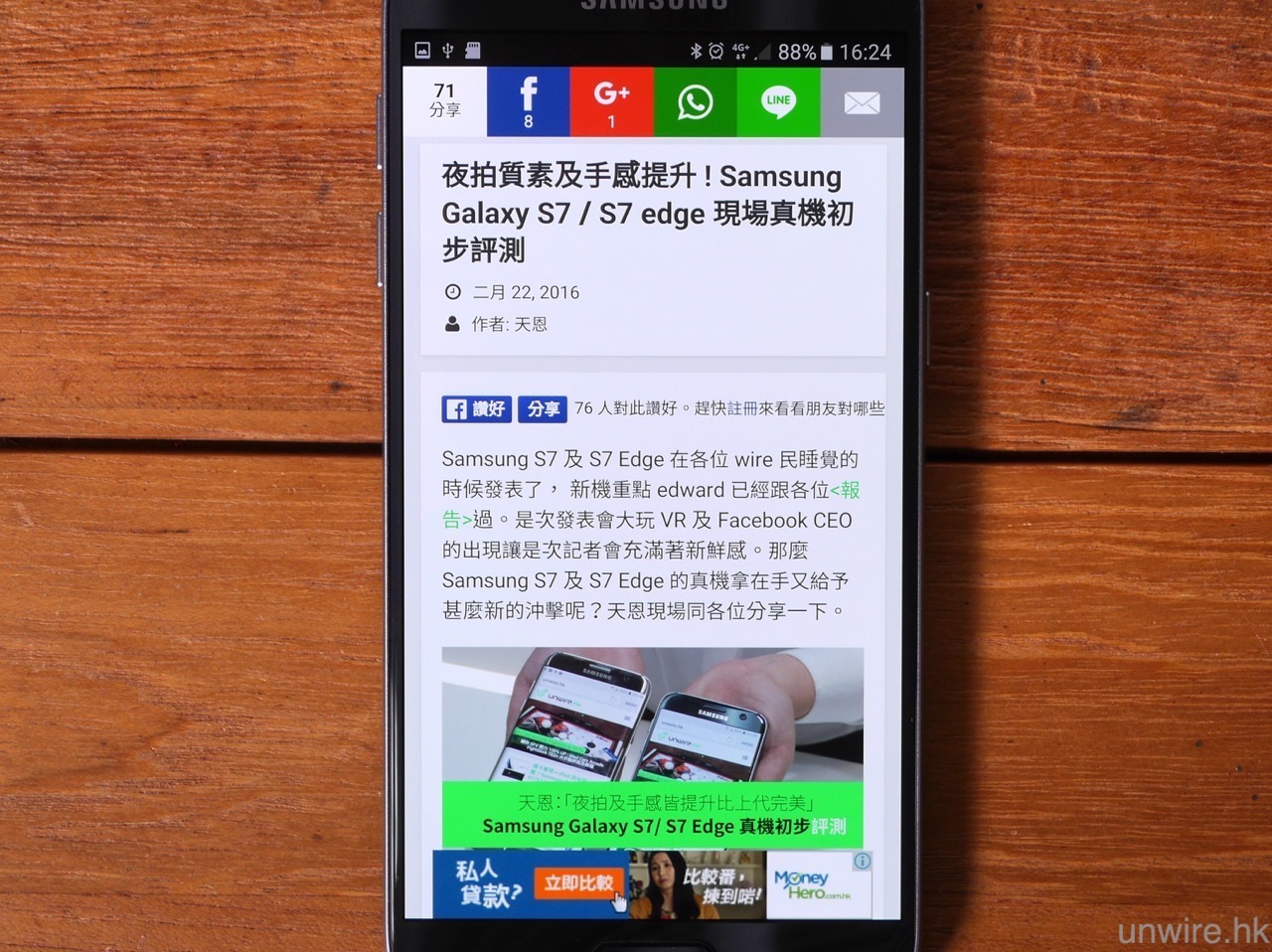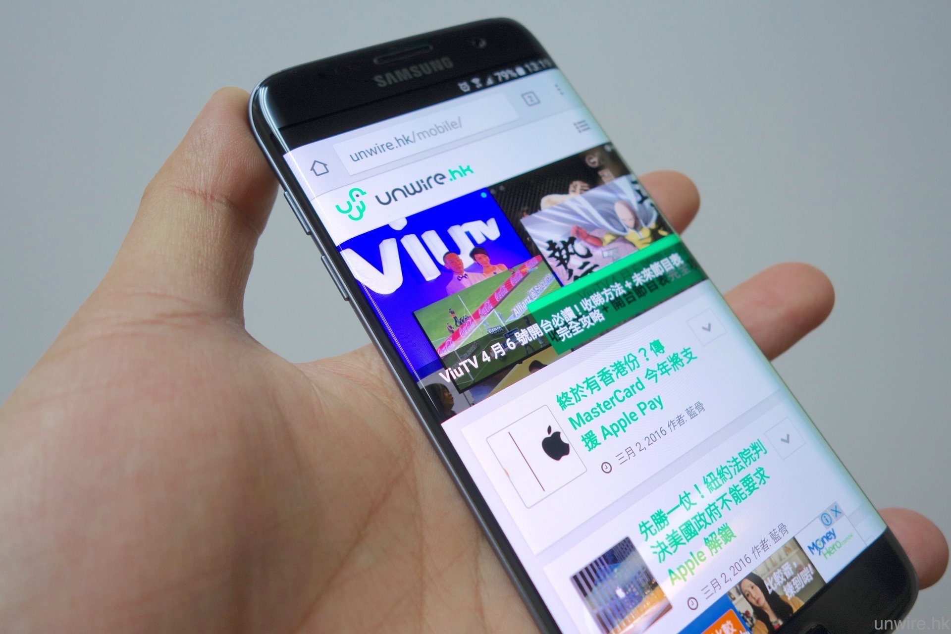 至於可視角度方面,AMOLED 熒幕亦一向擁有高可視角度的優勢,這一點在 S7 及 S7 edge 上亦見得到,筆者試過從側面去睇熒幕,亦未有見到亮度降低或變色的情況,這一點大家就不用擔心了。此外,相信有些 wire 民亦想知道 S7 edge 的曲面熒幕在瀏覽網頁時,邊位會否仍與上代一樣,出現文字現在曲面熒幕上,導致瀏覽困難的情況。筆者測試過後,發覺此問題仍然存在,相信這是用上雙曲面熒幕的「死症」,不過筆者看到不少網頁(包括 unwire.hk),在瀏覽內文時會刻意避開最邊位置不放文字,只要大家用「直度」模式瀏覽網頁,文字出現在曲面熒幕位置的機會是較細的。