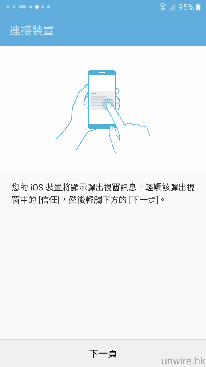 ▲然後 S7 會出現上面左圖的畫面,iPhone 就會出現右圖的畫面,在 iPhone 上點按「信任」,然後在 S7 上點按「下一頁」。此時你將 iPhone 放在一邊就可以了,不過緊記兩部手機連接千萬不要斷開!!