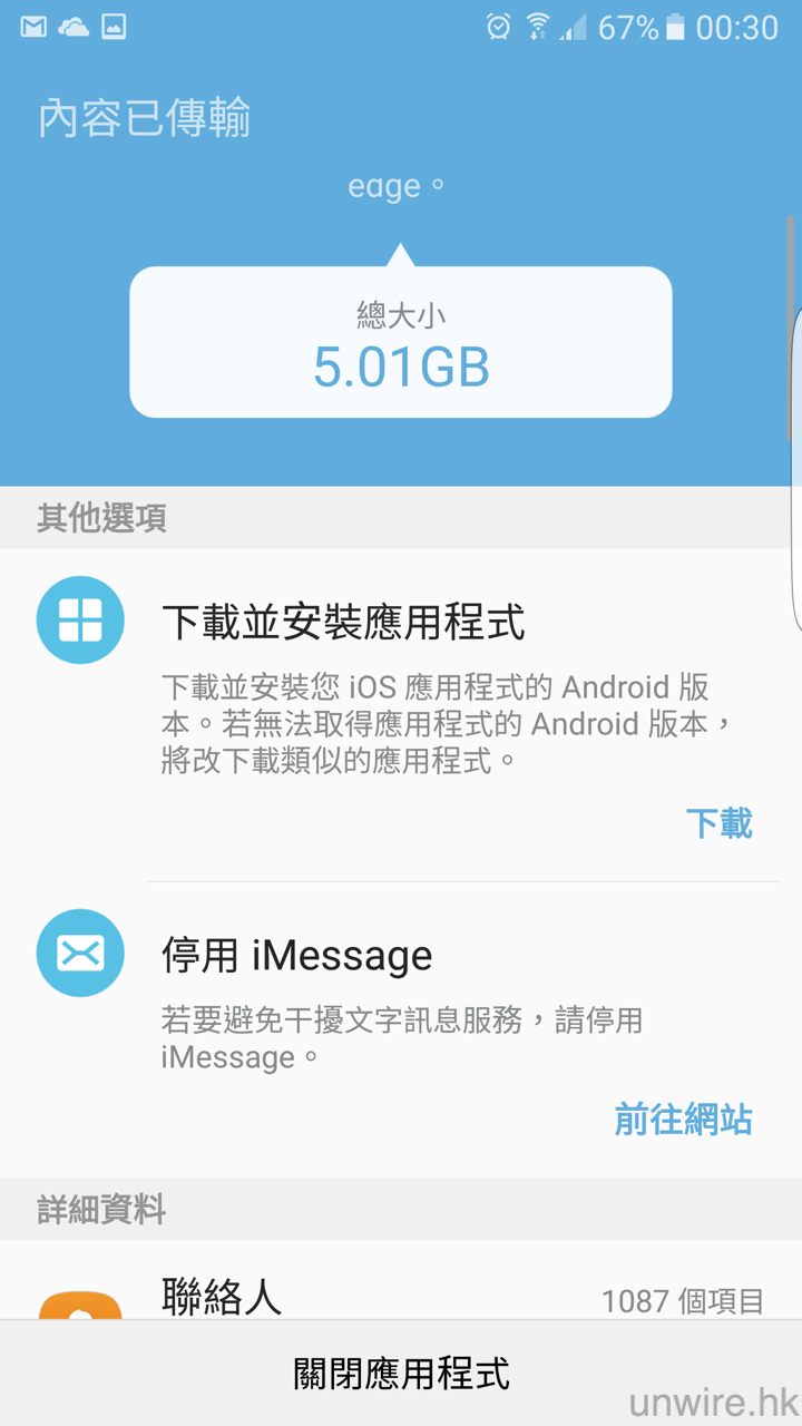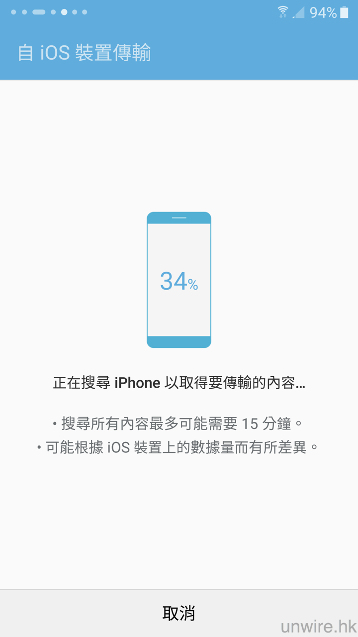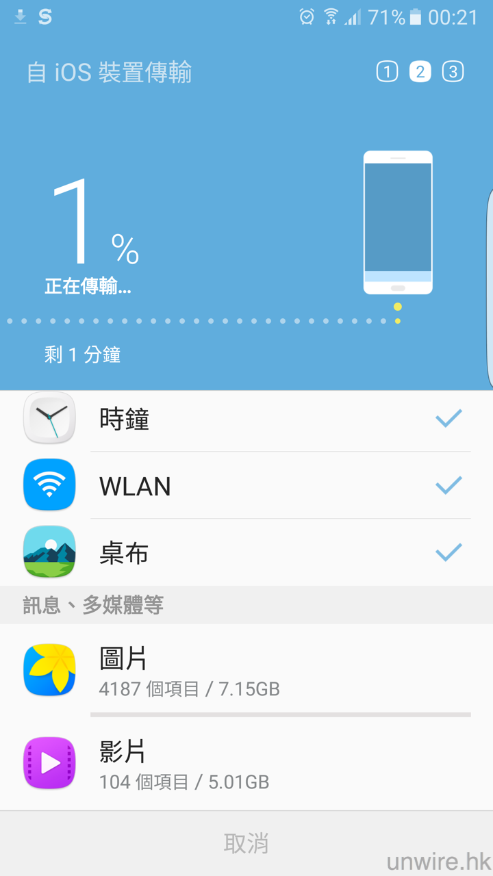 ▲此時 S7 會再提醒大家不要中斷兩部手機的連接,而進入 Smart Switch 軟件就可以看到傳輸進度。