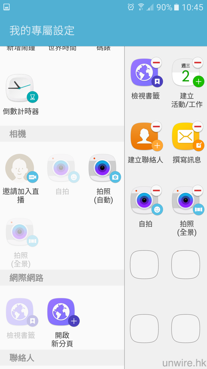 ▲而在「我的專屬設定」中,更可以自設直接進入哪些程式中的功能,例如:可以設定一個 shortcut 直接進入相機並進行 selfie,超方便。不過它暫時只限於使用內置程式,希望未來可以有更多第三方程式支援吧。