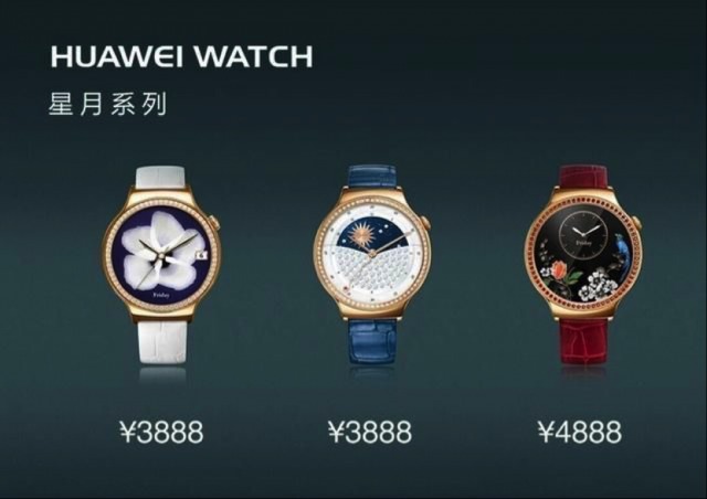 Huawei Watch 星月系列針對女性消費市場,錶盤直徑為 42mm,錶面螢幕直徑為 1.4 吋,採用了人工合成藍寶石玻璃素材,搭配牛皮製成,壓上鱷魚皮紋的錶帶。星月系列的 Huawei Watch 跟男裝版完全一樣,同樣內置特別設計的 Watch Face 錶盤。Huawei Watch 星月系列由即日起在官方網上銷售渠道和專門店發售,人造寶石版和天然寶石版分別售 3,888 和 4,888 人民幣(約 4,625 和 5,815 港元)。