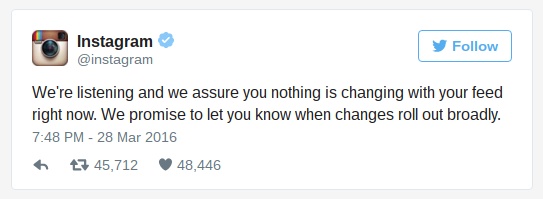 很多 Instagram 帳號紛紛要求粉絲開啟接收通知功能,然而這並非最好的解決方法。用戶總不能為了確保看到追蹤的 10 位明星相片,手機 24 小時不斷收到通知,這不但擾民亦不切實際。幸好 Instagram 的高層比 Facebook 有智慧,願意從善如流(筆者相信是暫時性),日前在 Twitter 宣佈有聆聽用戶的聲音,他們保證現時不會改變 Feed 的顯示方式,亦保證在重大改變前事先通知用戶。要做到從善如流其實不難,只是管理層有沒有承認失敗,採納用戶意見的心。