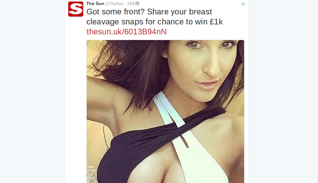 網民力量不一定釋放於政治議題上,正所謂「創作力量同幻想會嚇你一跳」,網民惡搞和幽默感往往足以玩壞在社交媒體發起的推廣,最近英國太陽報就有一個好好笑的例子。太陽報週三早上發 Tweet 要求女士們上載自拍「事業線」的照片,有機會獲得 1,000 英鎊的獎金。自拍事業線的相片很快就如雪片飄來,不過網民當然不會這麼順攤,上載予太陽報的不少都是重口味的男性事業線、惡搞,甚至是政治人物的照片(下面來一個大集合)。
