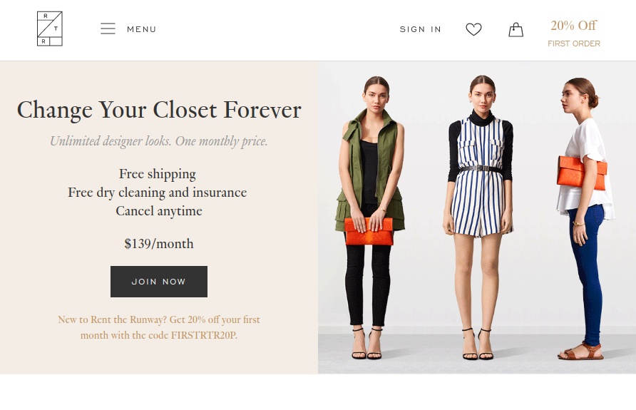 有研究指一般女性有 20% 的衣物購買後沒有穿著,放在衣櫃內鋪塵。有公司就想到參考 Netflix 的手法,以月費方式讓會員租用一系列最新的服飾。這間名叫 Rent the Runway Unlimited 的公司由日常的潮流服裝到設計師精品衣裙,甚至連首飾和包包配件等都有,通通毋須購買,只要支付月費就可以租借。