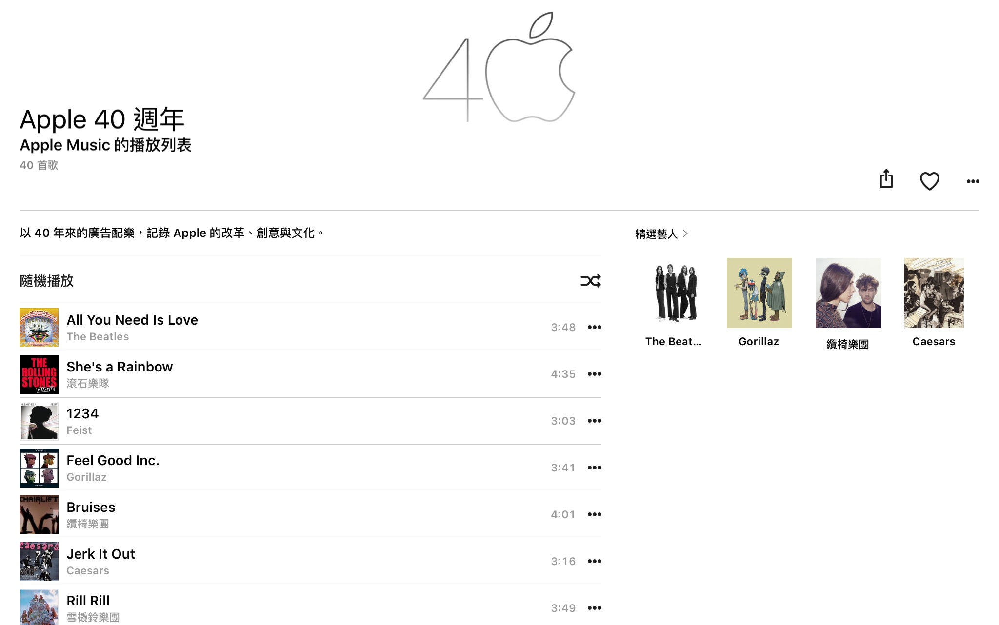 Apple 在簡介內表示「以 40 年來的廣告配樂,記錄 Apple 的改革、鍾意與文化」,Apple 40 週年的完整歌單如下: