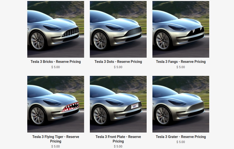 沒有了車頭的柵格,不少車迷認為 Tesla Model 3 的設計奇怪,然而 Tesla 3 Grilles 的特色貼紙設計卻讓車主自行補完,貼紙的設計種類繁多,有仿真柵格、不同顏色、毒蛇和鯊魚的嘴,甚至搞笑的「二撇雞」鬍鬚。根據網站的描述,店主的設計是源自網民對 Tesla Model 3 車頭造型評價,暫時預訂價格為 5 美元。如果 Tesla 能準時交付的話,新車還是要明年年底才會在路面出現,這裝飾貼紙會被車主們喜愛嗎?