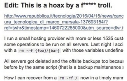 如果 Wire 民上星期看到一單新聞,有關一位網站寄存公司老闆因為輸入了一段簡單的 Code「rm -rf {foo}/{bar}」,令到整間公司的所有數據和網站資料,包括備份檔案通通毀於一旦。該名公司老闆及後在著名的 Server Fault 討論區求救,成為了 IT 界茶餘飯後討論的一則新聞。