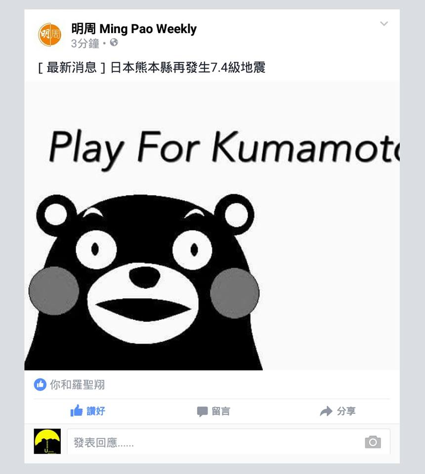 星期六凌晨日本熊本縣再發生 7.4 級地震,事件發生在香港時間約 12:25am,未知是否當值的明報周刊員工剛剛瞓著,還是一時大意,竟然製作了這幅「Play for Kumamoto」的黑白熊本熊作為突發新聞的配圖,雖然很快就已經被明周的 Facebook 管理員刪除,但已經被筆者的朋友發現 Cap 圖。新聞要快固然重要,但準確亦不可缺,尤其是這樣的低級錯誤,往往就是「唔使急,最緊要快」的結果。行家們,共勉之。