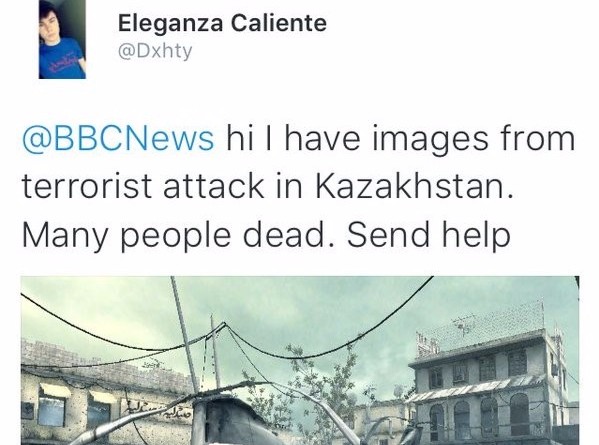 早前一名網民將遊戲《Call of Duty 4》的遊戲截圖透過 Twitter 傳送到 BBC 新聞部,表示「取得了哈薩克斯坦恐怖襲擊的畫面,很多人喪生,需要協助」。發 Tweet 不久,這名網民就收到了 BBC 國際事務記者 Ian Pannell 的回覆,查詢當地的救援狀況,並問候網民和家人,希望網民能夠給予回應。