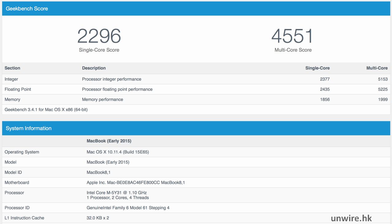 ▲至於效能方面,如果以 Geekbench 3 測試,可見整體分數第二代是比第一代 MacBook 差,但記憶體表現就提升了不少。