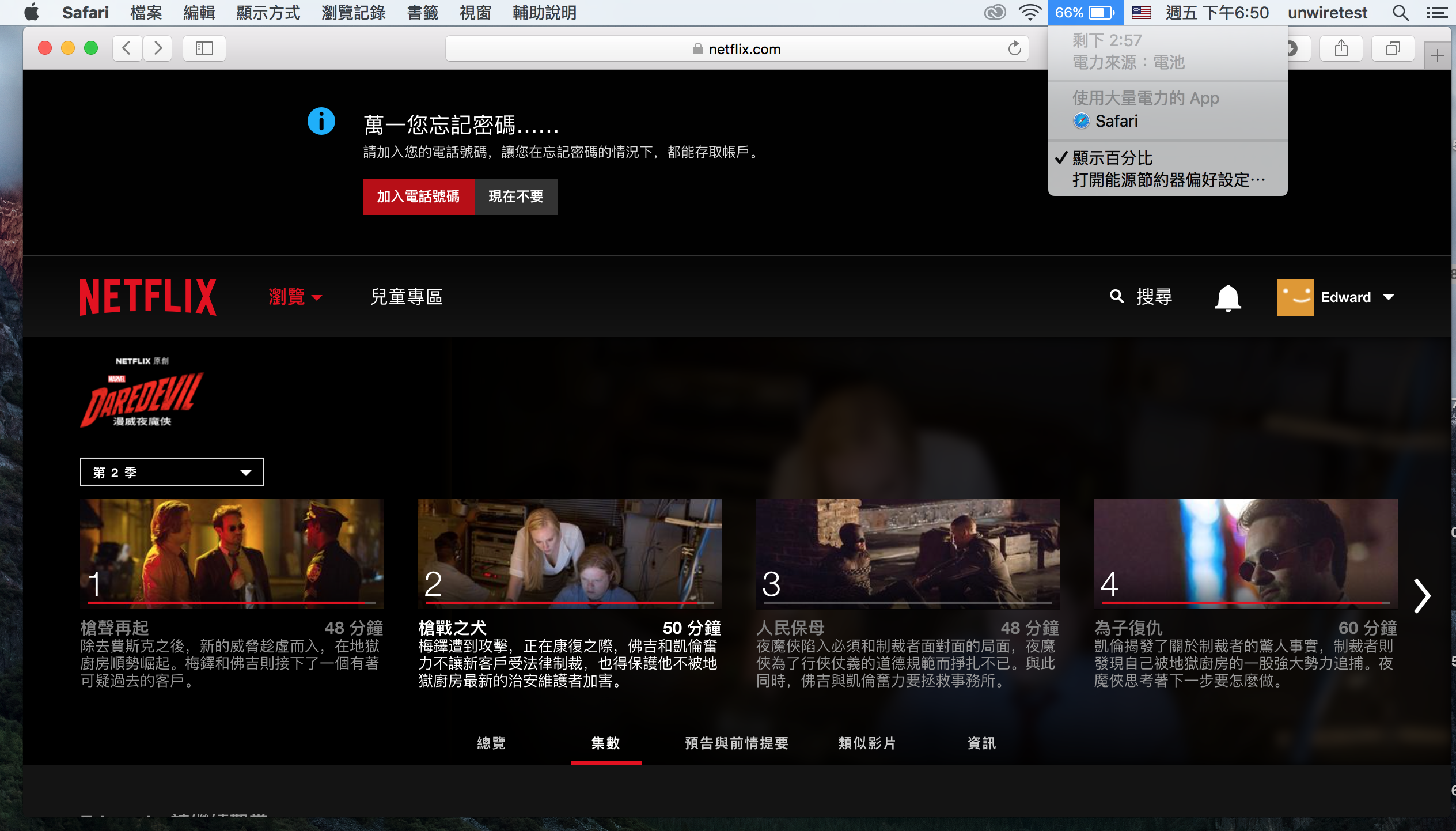 ▲使用第一代 MacBook 用 Safari 播放 Netflix 平台上《Dare Devil》第二季頭兩集,熒幕亮度開至最光,播了兩集後電量剩下 66%,以此推算第一代 MacBook 如連續以串流模式播放影片,大約最長可以播放 4 小時 48 分左右。