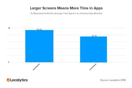 機構利用最受用戶歡迎的 Samsung 和 iPhone 手機,共 271 款作研究對象,當中有 2012 年的 Galaxy S3、Note 2,到最新的 iPhone 6s Plus 和 iPhone SE 都有。研究發現用戶的手機屏幕越大,使用 Apps 的時間就會越多。5 吋或以上屏幕用戶使用 Apps 的時間比 5 吋以下的多 23%,平均每月使用 Apps的時間亦有 65.93 分鐘,細屏幕的只有 52.23 分鐘。