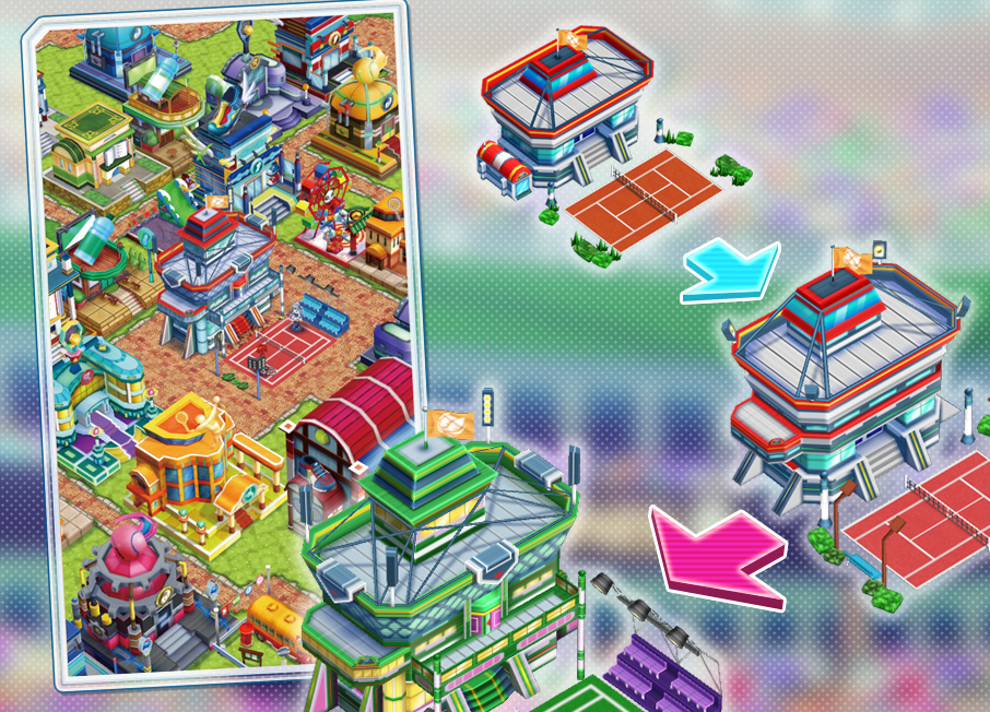 ▲二人示範遊戲,可見角色介面已像白貓,人物也有獨特的裝備 (網球拍) 及有升級用的 Soul Board。下面按鈕可見有 Tower、Tour、及 Town 三個地方。另外亦有扭蛋 Gacha Shop。