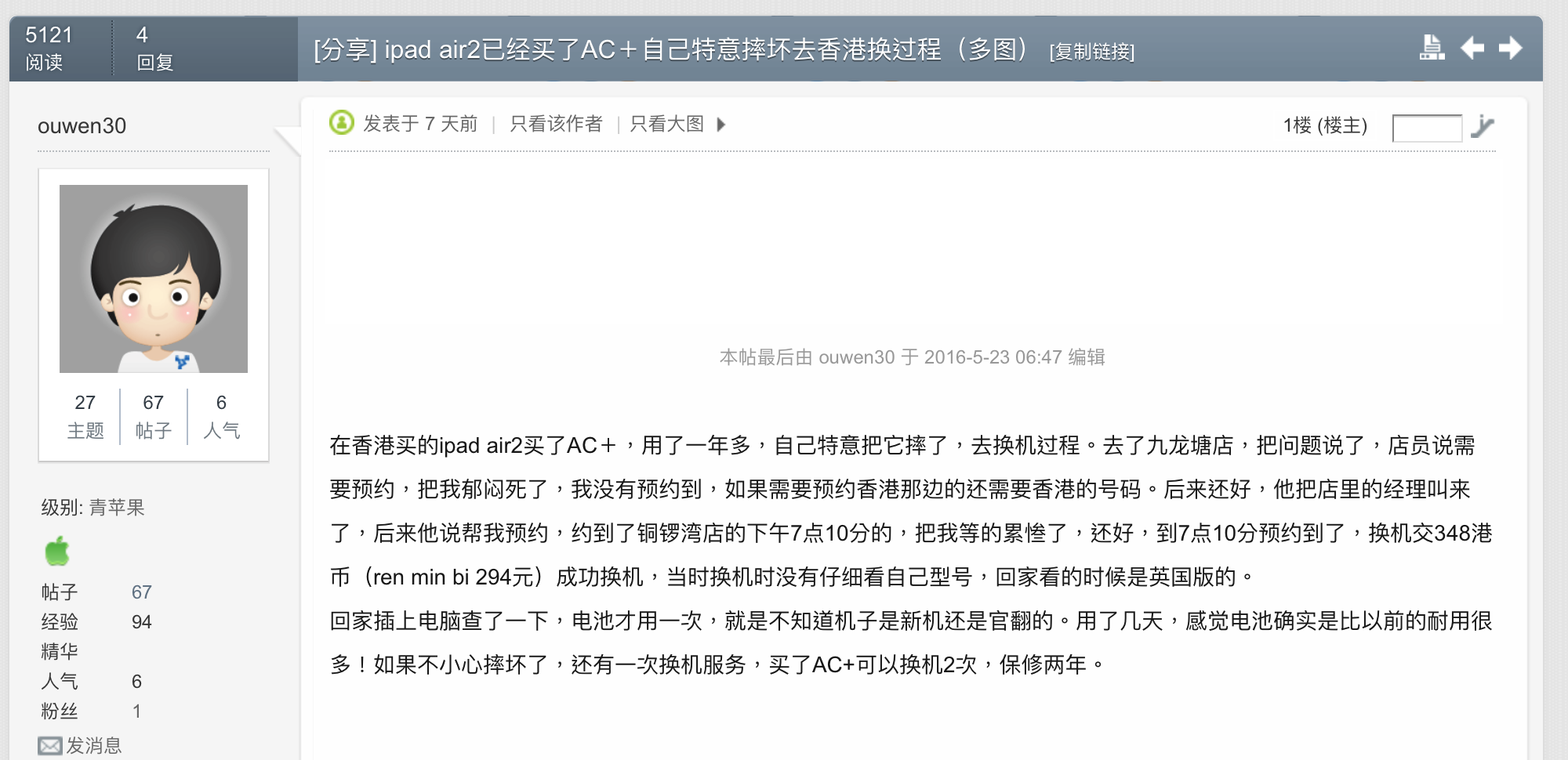 話說一位化名為 ouwen30 的中國網民之前曾經在香港買過一部 iPad Air 2,同時亦購入了 AppleCare+,而日前就公開了自己來港換機的經過。不過令人氣憤的是其 iPad 並非因為意外損壞才需要更換,反而他表示由於該部平板已經用了一年多,所以就故意將之摔壞,並希望可以換過一部新機。